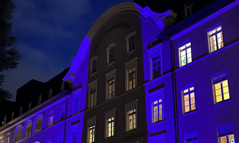 Zum Weltpankreaskrebstag, 20.11.2025, erstrahlt die Altbau-Fassade des St. Joseph Krankenhauses in einem intensiven Lilaton. Die Farbe wurde von der World Pancreas Cancer Coalition (WPCC) gewählt, um den weltweiten Aktionstag auch optisch hervorzuheben, da Lila unter anderem Hoffnung und Zuversicht symbolisieren.