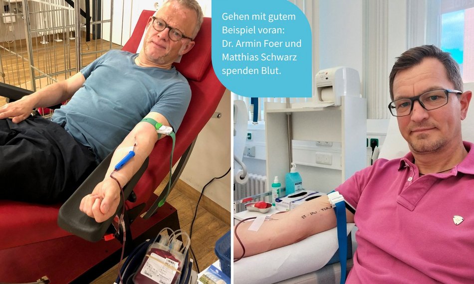 Die Hämotherapie funktioniert aber nur, wenn die Grundvoraussetzung gegeben ist: ausreichend Blut! Fakt ist, dass weniger als 3 Prozent der Bevölkerung Blut spendet. Gerade in den Sommermonaten kommt es immer wieder zu Engpässen, weil es in der Urlaubszeit weniger Blutspender:innen gibt. Chefarzt Dr. Foer geht regelmäßig Blutspenden und hat das Peer Review als Anlass genommen, erneut zu spenden. Dabei ruft er gleichzeitig alle potenziellen Spender*innen und besonders Erstspender*innen auf, ebenfalls zur Blutspende zu gehen: „Die Erfahrung zeigt, wer zum ersten Mal Blut spendet, macht es immer wieder.“ Wie Matthias Schwarz. Der kaufmännische Leiter am Franziskus Krankenhaus geht seit den 1990er-Jahren regelmäßig Blutspenden und war nach eigenen Angaben schon mehr als 120 Mal Spender. Nachdem er von dem tollen Erfolg von Dr. Foer und seinem Team erfahren hat, war er kurzerhand erneut Blutspenden.