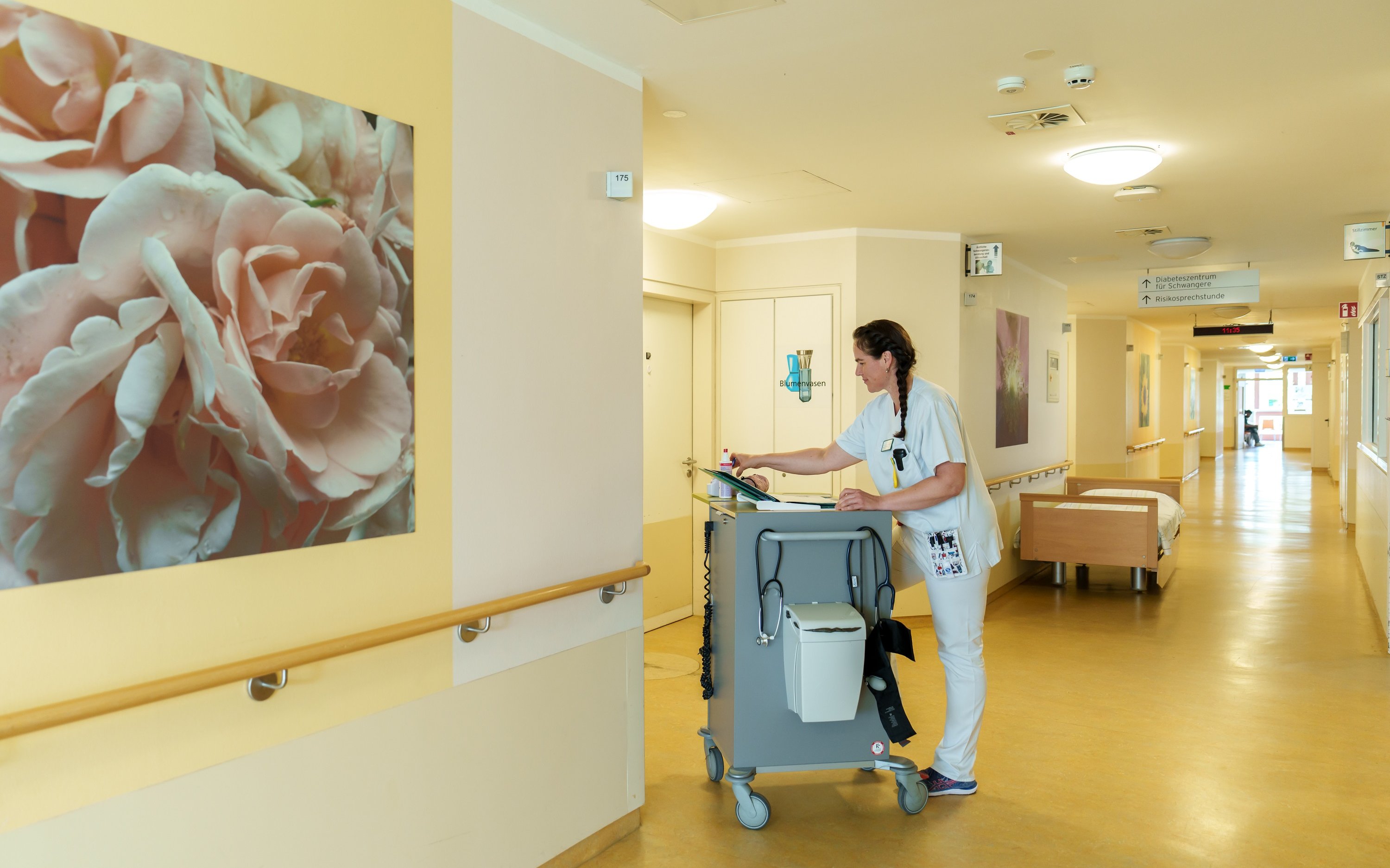 Unsere Klinik steht für eine sanfte, individuelle Geburtshilfe. Wir legen Wert auf eine ruhige, intime Atmosphäre in den Geburtsräumen und versuchen den Wünschen der Gebärenden gerecht zu werden. Mit sieben Geburtsräumen und gehört unser Kreißsaal deutschlandweit zu den größten. Für die werdende Mutter und ihre Begleitperson gibt es verschiedene Angebote, z.B. moderne Kreißbetten, der Maya-Hocker, Hängeseile und die Gebärwanne. Wir laden Sie ein, sich unter der Geburt zu bewegen und eine für Sie bequeme Position zu finden. Hebammen und Fachärzt*innen stehen rund um die Uhr für eine optimale medizinische Versorgung zur Verfügung.