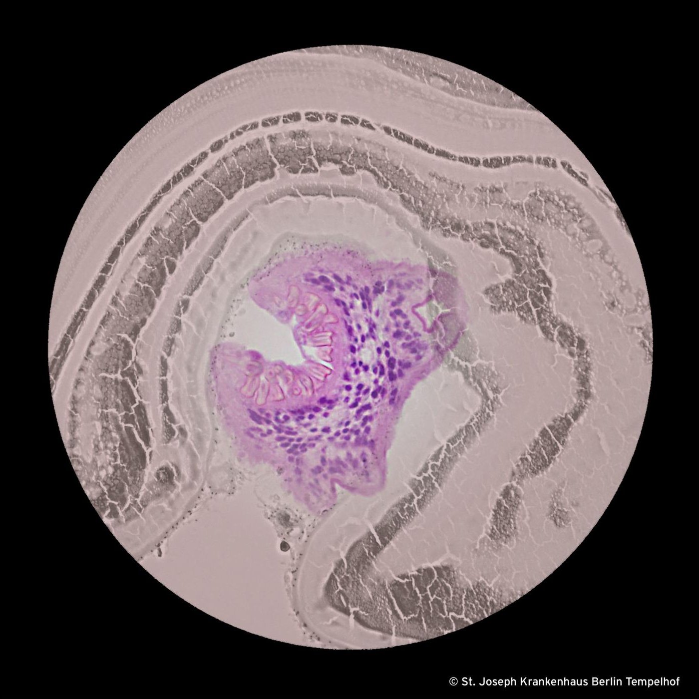Genau wie im Schaf schaffen es auch im Menschen einige der Onkosphären, an der Leber vorbei in andere Strukturen zu gelangen. Die Lunge ist oft die nächste Station aber auch die Knochen sind ein guter Landeplatz für E. granulosus. So war es bei unserem Patienten und unser Bild zeigt einen Anschnitt der lamellär geschichteten Zystenwand und in der Mitte einen stark vergrößerten angeschnittenen Protoscolex, mit einem Hakenkranz.