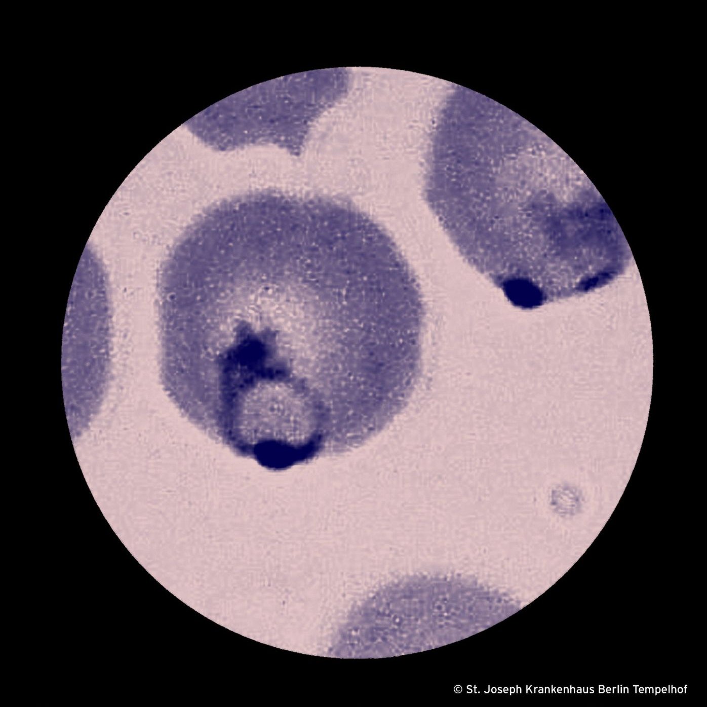 Im Ausstrichpräparat unserer Patientin, das Frau Dr. Ute Aurbach vom Tropeninstitut der Charité für unser Infektoskop fotografiert hat, beherbergten 5 Prozent der Erythrozyten Ringformen von P. falciparum. Mikroskopisch und per PCR fanden sich keine Hinweise auf eine akute Infektion mit P. vivax oder eine der anderen nicht-falciparum Spezies. Mit diesem Ergebnis waren beide positiven Banden des Schnelltests erklärt. Mit diesem Ergebnis war auch eine Rekurrenz einer Malaria tropica gesichert. Mit diesem Ergebnis war eine Rekurrenz eine Vivaxmalaria sehr unwahrscheinlich. Rekurrenz?