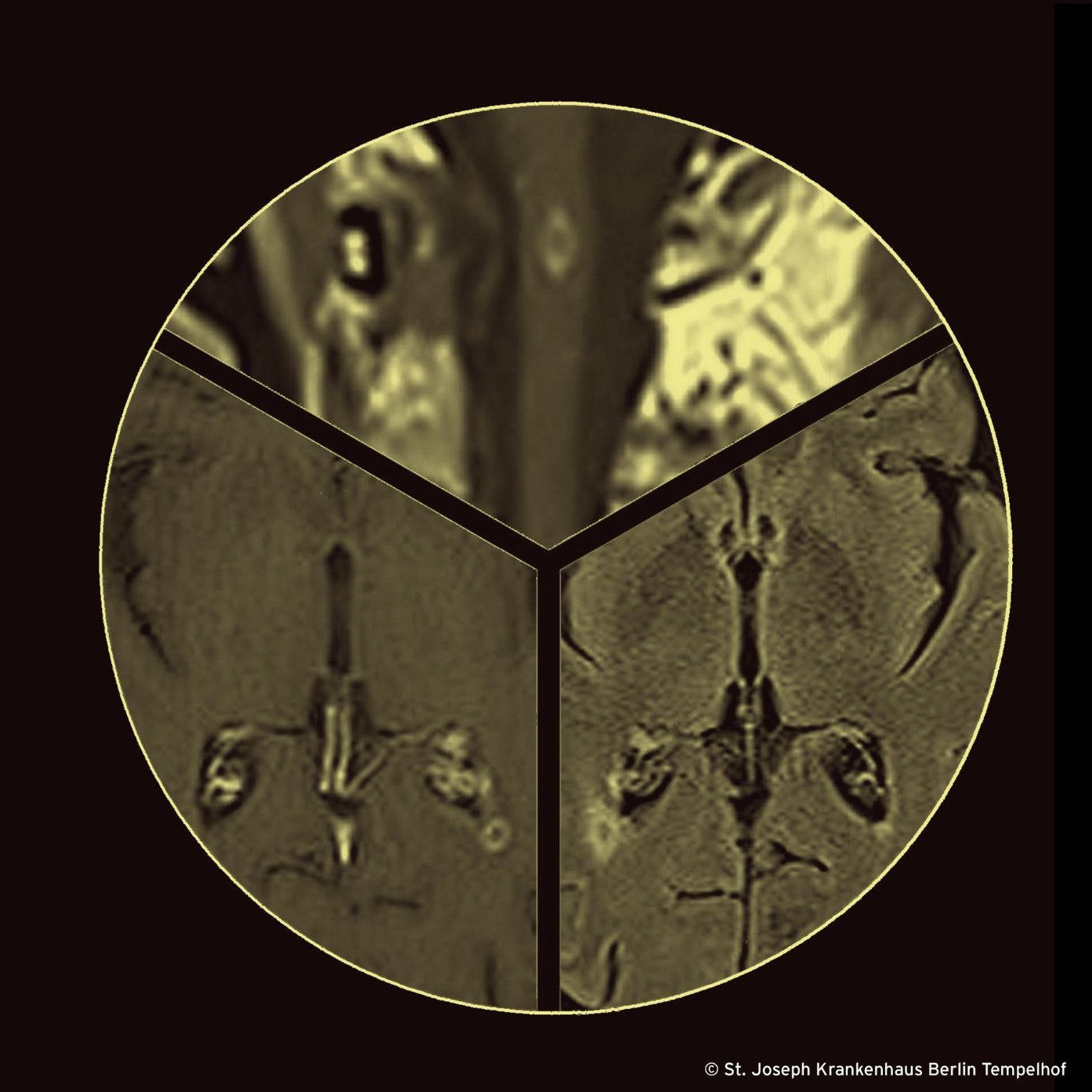 Im farblosen und klaren Liquor war mittlerweile die Zellzahl auf 232/µl angestiegen. Die Pleozytose war 100 Prozent lymphozytär. Das Eiweiß im Liquor betrug 1,1g/L, die Glucose war mit 16mg/dL (0,9mmol/L) erniedrigt. Das Laktat war 1,6-fach über den oberen Normwert erhöht. Keine oligoklonalen Banden, keine intrathekale IgG, IgA oder IgM Synthese im Quotientenschema. Die MR-Bildgebung des Gehirns zeigt wenige ringförmig kontrastmittelanreichernde Herde ohne relevantes Umgebungsödem.