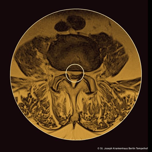 Ein spinaler Gichtanfall, der sich als Epiduralabszess präsentiert? Eine ungewöhnliche Diagnose, ein echter Kolibri! Doch ist die spinale Gicht wirklich eine Seltenheit? Um das Krankheitsbild unseres Patienten besser zu verstehen, lohnt ein Blick auf den natürlichen Verlauf der Gicht: Der typische Anfall, die Arthritis urica, ist eine inflammatorische Monarthritis, die durch die Ablagerung von Natriumurat-Kristallen in der Synovia ausgelöst wird und sich klassischerweise an den Gelenken der unteren Extremitäten manifestiert. Sie verläuft selbstlimitierend, führt aber bei unbehandelter Hyperurikämie zu neuen, rekurrenten Anfällen, die jedes Gelenk des Körpers betreffen können. Mit der Zeit nehmen polyartikuläre Anfälle zu und letztendlich führen Uratablagerungen an allen möglichen Gelenken zur chronischen und destruierenden Gichtarthropathie. Die jahrzehntelange Leidensgeschichte unseres Patienten erzählt somit die Geschichte einer klassischen chronisch-tophösen Gicht. Spinale Manifestationen in diesem Stadium sind in Wahrheit keine Seltenheit. Tophi und typische Erosionen lassen sich in 14-35 Prozent der Fälle nachweisen [6, 7]. Diagnostiziert wird die Erkrankung trotzdem nur selten, da spinale Gichtanfälle oftmals als akute oder chronische Rückenschmerzen verkannt werden und so unter dem Radar der behandelnden Ärztinnen und Ärzte verlaufen. Selbst nach invasiven diagnostischen Prozeduren wird die Diagnose nur selten gestellt, da aus der Wirbelsäule gewonnene Proben meist nur in der konventionellen Patho, wenn es gut läuft auf der Petrischale aber nicht unter dem Polarisationsmikroskop landen. Fairerweise sei angemerkt, dass spinale Abszesse trotzdem sehr ungewöhnliche Gichtmanifestation sind und regelmäßig zu diagnostischen Schwierigkeiten führen [8, 9]. In unserem Fall ging der Epiuduralabszess (der in unserem T2 gewichteten Bild als hyperintense linsenförmige Struktur im Kreis zu erkennen ist) vom rechten Facettengelenk zwischen dem 3. und 4. Wirbelkörper aus.